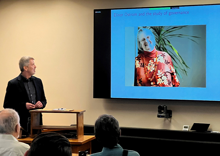 The Vincent and Elinor Ostrom Memorial Lecture was established in 2015 to honor and celebrate the life and work of the Ostroms. The 2022 lecture was provided by Scott Gehlbach, Professor, Department of Political Science and Harris School of Public Policy, at the University of Chicago. A political economist and comparativist, Gehlbach’s work is motivated by the contemporary and historical experience of Russia, Ukraine, and other postcommunist states. His topic for the Ostrom Memorial Lecture was “Governing the Autocracy: The Nature of Institutions for Authoritarian Rule”. The evening was very well attended by both new Workshoppers and those who knew Vincent and Lin for many years. After the lecture and discussion, a wonderful reception ensued with a four foot charcuterie grazing board and Jacobs School of Music Violin and Viola duet playing in the foyer (Ross McIntosh and Tom Mathias).