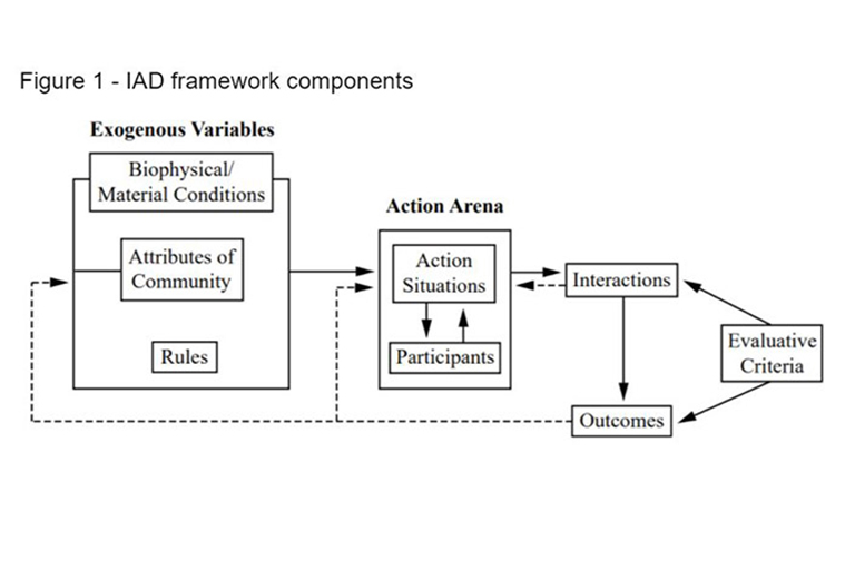 IAD framework divides situations into "action arena", which include "participants" and "action situations". "Participants" are influenced by "Exogenous Variables", making choices within existing "rules", and engaging in “interactions”. Both the Exogenous Variables and “participants” interactions result in outcomes, which are evaluated by the “participants”. Such evaluation influences other components in the framework.