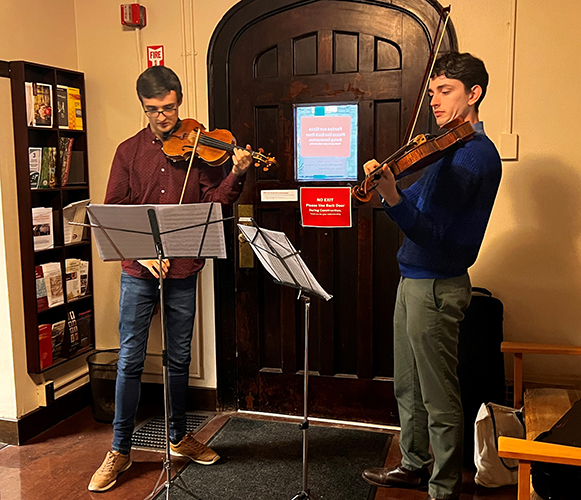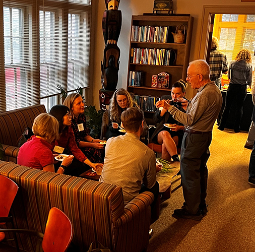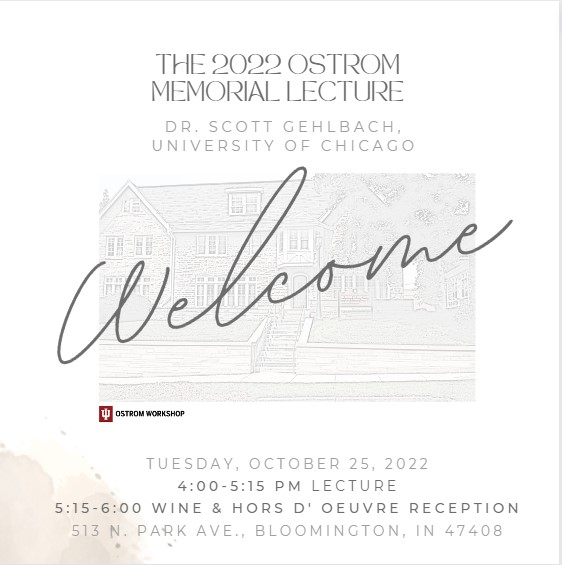 The Vincent and Elinor Ostrom Memorial Lecture was established in 2015 to honor and celebrate the life and work of the Ostroms. The 2022 lecture was provided by Scott Gehlbach, Professor, Department of Political Science and Harris School of Public Policy, at the University of Chicago. A political economist and comparativist, Gehlbach’s work is motivated by the contemporary and historical experience of Russia, Ukraine, and other postcommunist states. His topic for the Ostrom Memorial Lecture was “Governing the Autocracy: The Nature of Institutions for Authoritarian Rule”. The evening was very well attended by both new Workshoppers and those who knew Vincent and Lin for many years. After the lecture and discussion, a wonderful reception ensued with a four foot charcuterie grazing board and Jacobs School of Music Violin and Viola duet playing in the foyer (Ross McIntosh and Tom Mathias).